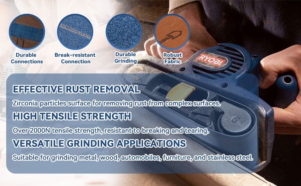 Crafted with premium blue zirconia particles, our 7 grits zirconia sanding belt set delivers unmatched sharpness and durability compared to conventional sanding belts. Ideal for woodworking, hard metal, plastics, and stone, these belts offer extended lifespan and superior heat management, maintaining peak performance even during heavy-duty use.