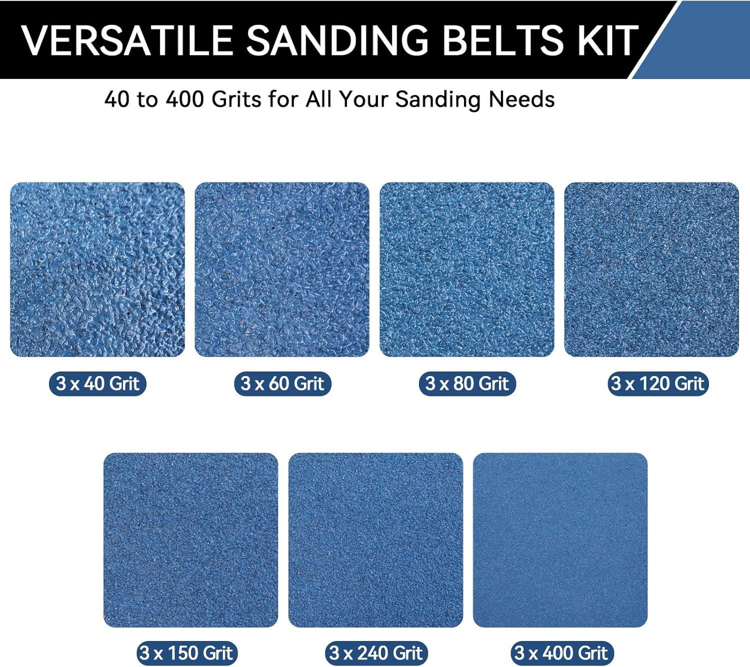 – 7 Versatile Grits: 40, 60, 80, 120, 150, 240, 400 grits (3 pieces each) for complete sanding stages, covering rough material removal to fine polishing.